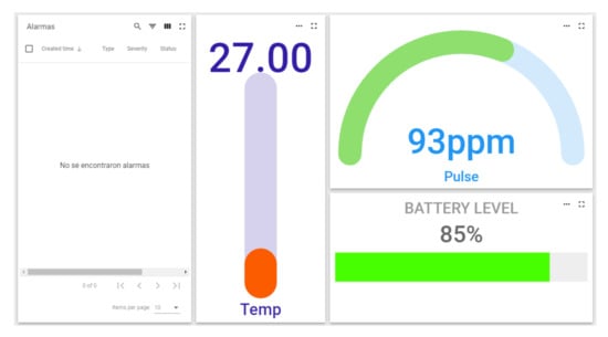 The Smart PPE bracelet consists of electronic components welded to a flexible protoboard. These are ESP32 with an LCD display, buzzer, LED strip and monitoring sensor composed by IMU, temperature sensor, pulse sensor and panic button. The objective is to favour the interaction and monitoring of the user and the environment. For human activity recognition (HAR), a BMI160 inertial sensor (IMU) from Bosch (Stuttgart, Germany) provides precise acceleration and angular rate (gyroscopic) measurement. We measured the user’s body temperature through a Thermocouple Type-K Glass Braid Insulated Stainless Steel Tip from Adafruit (New York, NY, USA), which are best used for measuring surface temperatures. To measure the pulse rate, we used photodiode sensors, which have two light emitters and two light receivers and can measure the heartbeat, causing the reflected light to vary at each instant; this makes it possible to estimate the measurement of the pulses per minute. Figure 4 shows the bracelet with the panel and different sensor indicators.