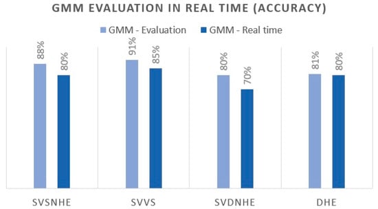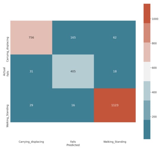 The bracelet uses two models. The first is the Gaussian mixture models focused solely on the analysis of the vital signs of the worker or user, as well as the status of the bracelet. The second model is the LSTM neural network, used to analyse the human activity behaviour, see Figure 8 where it shows the classification results of a GMM for four different classes, with an average performance in real-time of 78.75%, and Figure 9 where the results obtained for the GMM and LSTM are shown, respectively. The confusion matrix LSTM indicates the other model selected for the developed bracelet as GMM did not have a sufficient level of generalisation by itself. It can be seen that the best class performance was 96.14% for the WalkingScaling class, 89.2% for Falls and 77.06% for Carrying, which is the most difficult class to predict in our dataset.