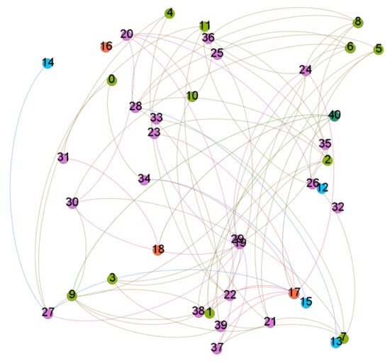 The graph created with the different labels can be seen in Figure 11. This image represents the relationship that exists between the labels when analysing the three devices in parallel; as mentioned, we want to reduce the risk of misclassification by finding the relationship between the output labels of each model, i.e., the input of the analysis by heuristics is the output of the models of the electronic devices. For the network generated with the different outputs of the four integrated models, each colour represents belonging to a certain model, for example, the 3 orange nodes represent the output of the LSTM (3 classes), the 4 blue nodes the 4 of the GMM, the 12 green nodes to the CNN and the rest to the Naive Bayes. This is how to achieve the joint responses of all the models.