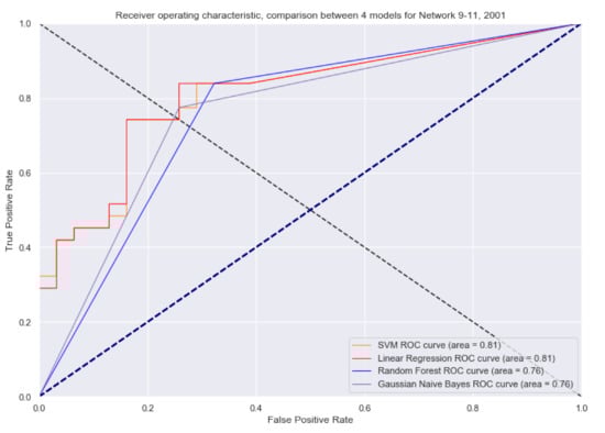 Based on the above, we made a comparison between a Gaussian Naive Bayes, random forest, support vector machine (SVM) and a linear regression, where the result is quite favourable, see Figure 13. This allows us to see that there is a strong relationship when any of the labels warn the user of a danger in their environment or they are alerted of their vital signs, which likewise, allows the integration of the three devices that have been developed.