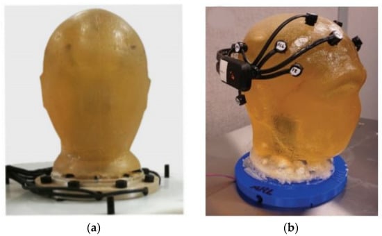 For the validation of EEG electrodes, it is, therefore, required to develop head phantoms as maintaining a constant brain activity is hardly possible. Hence, it is required to conduct a test in an environment as realistic as possible with a known ground truth of source location and brain activity. This can be performed via digital phantoms by modeling the propagation of the signal originating within the brain to the electrodes [2]. However, the studies via digital head phantom are hardly suited to mimic motion artifacts of a realistic EEG, electromagnetic interference noise generated by the power lines, and high power electronic equipment [3]. For that reason, many researchers have developed head phantoms predominantly from ballistic gelatin [4,5,6,7,8]. Gelatin-based materials are a good material to be used in phantom applications, but unfortunately, this type of phantom has a short life span [9] and is too heavyweight. Examples of gelatin-based head phantoms are shown in Figure 1.