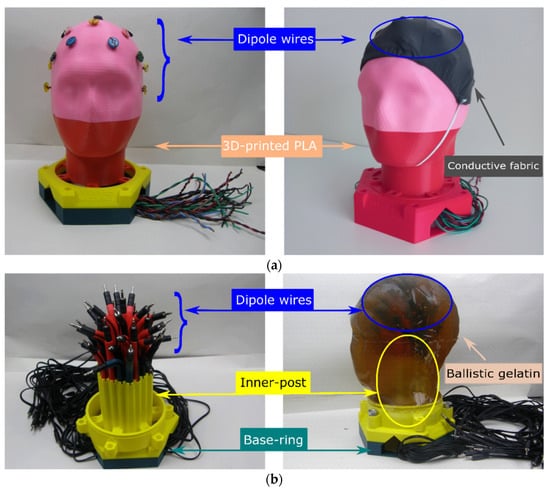 A textile-based head phantom was constructed by placing a bi-directional stretchy nylon/spandex (18:7) EeonTex conductive stretchable fabric (obtained from MANDU, Finland) over an anatomically realistic 3D-print polylactic acid (PLA) skull. The conductive fabric has a surface resistivity that can be custom-tuned for specific requirements in the range of 104 to 107 Ω/square. To mimic the neurons, twenty (20) 3.5 mm stereo male–male dipole wires were installed underneath the conductive fabric per the 10–20 EEG placement system as shown in Figure 2a. Side to side, a gelatin-based head phantom was also constructed from 900 g gelatin, 40.5 g table salt, and 4.5 L demineralized water according to [15], for comparison. Thirty-seven (37) dipole wires were installed inside the ballistic gelatin as shown in Figure 2b. The skull, base-ring, inner-post, and guiding wires have been constructed from PLA using an FDM 3D printer at Ingegno Maker Space (Drongen, Belgium). The photographic images of the constructed textile and gelatin-based head phantoms and their components are shown in Figure 2a,b, respectively.