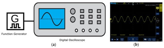 Synthetic sine wave generation: (a) wave generation setup using a function generator and digital oscilloscope; (b) the photographic image of the generated synthetic sine wave.