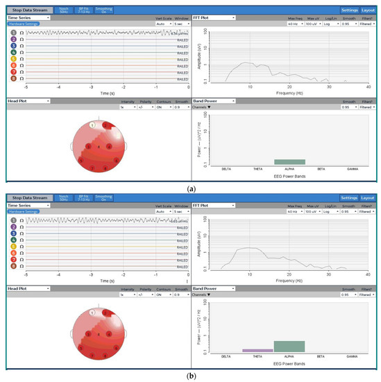 EEG signal from OpenBCI board: (a) textile-based head phantom; (b) gelatin-based head phantom.