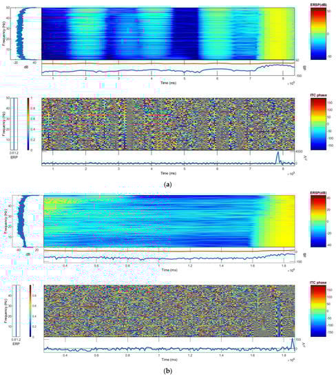 The event-related spectral perturbation (ERSP) and inter-trial coherence (ITC) time-frequency measurements were then processed and analyzed via EEGLAB software that is treated as in Equation (5) according to spectral and coherence estimates on EEG recordings [17]. ITC is computed from single-trial EEG to reflect the temporal and spectral synchronization within EEG, explaining the extent to which underlying phase-locking occurs [17].