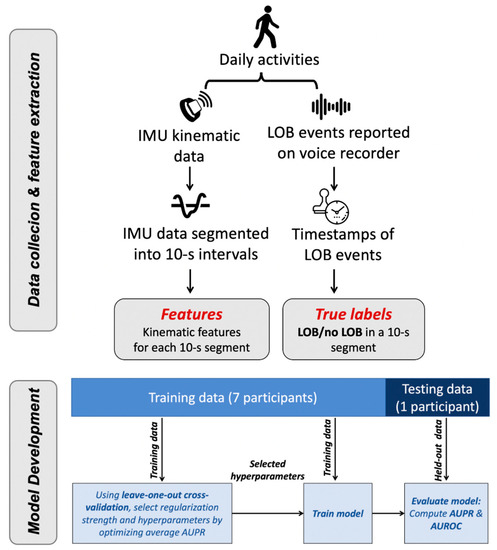 Overview of methods. Kinematic data were collected via wearable IMUs and used to extract relevant features. LOB events were reported and time-stamped to create true labels in the dataset. ML models were trained using leave-one-out cross-validation to automatically label LOB events based on kinematic features. Model performance was evaluated with respect to the AUPR and AUROC.