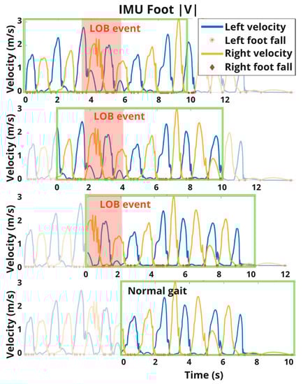 We used custom algorithms to integrate six-dimensional raw IMU sensor data (gyroscopes and accelerometers) to obtain foot orientation, velocity, and position using zero-velocity updates (ZUPT) to correct for sensor drift as described in Ojeda et al. [29,30]. Using foot trajectories, we determined individual strides and timing information and computed several common gait parameters (e.g., stride length, stride time) [31,32]. For each 10 s window, we extracted 32 features from the IMU data. Since the IMU data were collected in unscripted, real-world settings and included various activities other than gait, we first extracted a gait/no gait feature. We included a gait indicator feature since LOB events often arose from trips and slips during gait. A gait determination was assigned to each segment if it contained five or more strides longer than 0.1 m, where footfalls were detected based on foot velocities, assuming that the feet came to rest during the stance phase. This condition was defined based on reference gait parameter data for healthy participants ranging in age between 10 and 79 years [33]. The validity of this gait indicator was assessed visually to confirm that it correctly indicated walking segments. In addition to the gait indicator feature, we extracted 31 additional gait metrics corresponding to the total distance traveled, stride time, stride length, trunk angles, and angular velocities (Table 1).