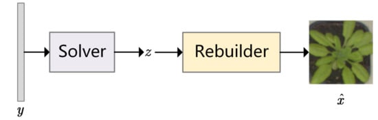 Set as the image we sought to sense and as the measurement matrix. The measurements are obtained by Equation (1). Set as the low-dimensional representation and as a nonlinear mapping from to , . The solution of Equation (1) is transformed into a nonlinear least square problem: