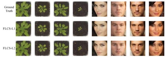 In this subsection, we evaluate the performance of FLCS-L1 and FLCS-L2. FLCS-L1 employs L1-norm to constrain the error of reconstruction image and the original image , , FLCS-L2 employs L2-norm. FLCS-L1 and FLCS-L2 are trained with the same dataset, learning rate, and iterations. Figure 3 presents some reconstructed samples of FLCS-L1 and LFCS-L2 on two image sets at the sampling rate of 0.1. Both methods are suggested to be able to reconstruct images with high quality, whereas FLCS-L1 outperforms FLCS-L2 in image details. Specifically, the color of the first image reconstructed by FLCS-L1 is significantly closer to the ground truth than FLCS-L2. For the last image, FLCS-L1 is more precise in reconstructing eyebrows and eyes.