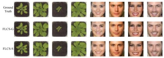 In this subsection, we validate the effect of the learned measurement matrix for improving FLCS. The network architecture of FLCS-G is identical to that of FLCS-S. They are trained with the same dataset, learning rate iterations. The difference is that the measurements of FLCS-G are obtained by projecting the image with Gaussian random matrix , , while FLCS-S adopts the learned measurement matrix. The measurements of FLCS-S are the output of Sampler, . Figure 4 shows some reconstructed samples of FLCS-G and FLCS-S on two image sets at the sampling rate of 0.1. It is shown that the quality of images reconstructed by FLCS-S is significantly better than that of FLCS-G. Specifically, the details of plant images reconstructed by FLCS-S are more precise, and the target’s edge and color are closer to the ground truth. Furthermore, the results on face images are consistent. The fifth sample reconstructed by FLCS-G is fuzzy and contains considerable noise, whereas that of FLCS-S is clear and natural.