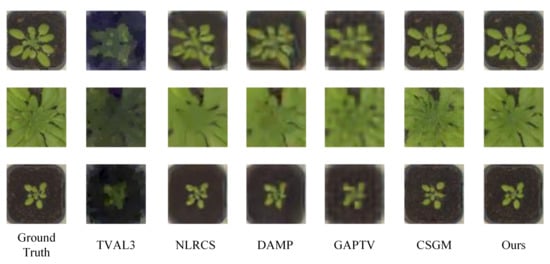 Some reconstruction samples of plant seedling images with . The first column gives the ground truth. The last column is the images reconstructed by our approach. The others are the results of comparison methods.