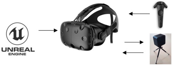 HTC Vive has development compatibility with the Unity and Unreal Engine 4 game engines. For this work, we chose Unreal because of its more straightforward coding method (C++ coding allows the possibility of coding through blueprints and Visual Studio) [30,76,77]. Unreal is developed by Epic Games and is free for use for academic purposes. Figure 1 shows the components selected to implement the experiment.