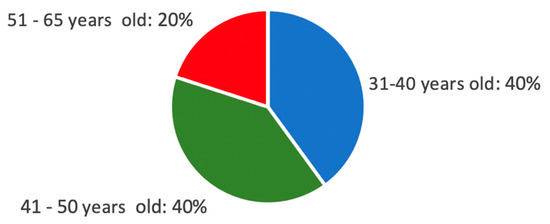 Considering this, the sample was composed of 10 (5 male and 5 female) volunteer specialists in risk management/architecture/engineering with more than 5 years of experience. All of them agreed to collaborate with the research and approved the informed consent to conduct the evaluation. Twenty percent of the sample had never used an HMD, while 80% had tried it once. All participants reported normal or corrected-to-normal vision and ranged in age from 31 to 65, as demonstrated in Figure 2. They all reported that they had no physical or mental conditions that they believed would prevent them from participating in a VR immersive game simulation.