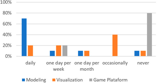 With regard to game experience and technological knowledge, 20% of the users were frequent players. 3D technologies were frequently used by the participants, not for game purposes but for professional reasons, as shown in Figure 3.