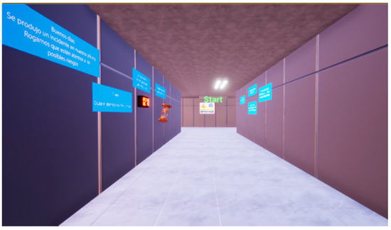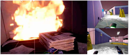 To increase the involvement of the subjects, a game-based virtual environment was designed by a multi-disciplinary team composed of designers, programmers, multimedia animators, and specialists in educational technology and human computer interaction (HCI). We aimed to create an atmosphere of fear, because emotional arousal (especially with negative emotions) positively affects presence [78,79,80] and retention [79,81]. However, we aimed to prevent discomfort for the users to avoid diminished performance on difficult tasks [82]. Special attention was paid to the context, design, navigation, task to be performed, presence, involvement of the subject, and preventing sickness.