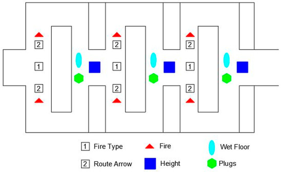The experimental conditions were created with reference to conventional ANSI Z535.2 and ISO-type warnings of a wet floor, fire, height, fire classification and indicative arrow. The selected warnings and a description of their variables can be seen in Table 2. They were displayed near the referenced hazard (for which the user was alerted about the risk) or at strategic points (educative and route signals).
