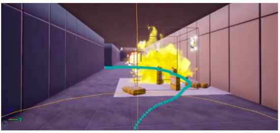 The participants were asked to cross the maze in the shortest time possible. The time was used to increase the challenge aspect. They were verbally warned that there were hazards on the way. Specifically, with regard to the fire risks, they were informed that they would be able to solve the issue using the fire extinguisher (and earn a bonus of an extra 10 s) or just pass by. The player knows the amount of bonus time gained through an explosion of a green “+10”. For this we used Cascade, the participle effect creation software from Unreal 4. If they assumed a risky position, they lost 10 s.