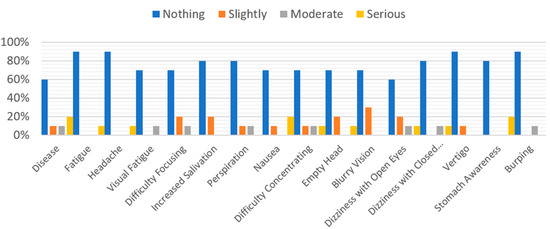 With regard to simulation sickness, the data showed a low rate of discomfort, as shown in Figure 8. One possible cause of this distress could be if the experiment was conducted just after the user had eaten.