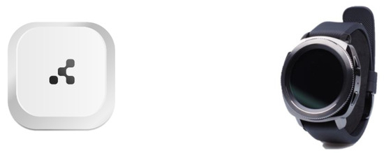 Multiple beacon transmitting devices (i.e., one BLE beacon for each room), and one receiving device (i.e., one smartwatch) can enable in-home room-tracking of a specific subject. Among the vendor-defined protocols for BLE beacon sensors, we picked iBeacon, which is composed of a Universally Unique Identifier (UUID), a major ID, a minor ID and the transmission power [15]. We used the UUID as an identification label for the beacon and we set the transmission power of all beacons to the maximum value (7) to maximize the chance of receiving signal from the beacons even if there are obstacles in between the receiver and the iBeacon. Figure 1 shows the iBeacon sensor (kontakt.io smart Beacon [16] that can provide over 4 years of battery life) and smartwatch (Samsung Gear Sport [17]) used in the study. Each iBeacon transmits a signal with their UUID at a frequency of 1 Hz. The 1 Hz sampling frequency aims to allow for the maximum amount of received signal, given that collisions, interferences, etc. result in missing values as described in Section 4.2.