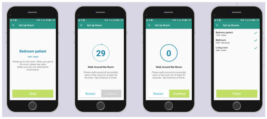 Each iBeacon had to be installed in a specific room as the smartphone application indicated. When the participants performed the experiment, they went to the relevant screen on the smartphone application. The application asked the participants if they were wearing the smartwatch and if they had already set up the iBeacons in the appropriate rooms. If they clicked yes, then the application instructed them to go to a specific room, and click on the screen once they were there (which started the ground truth recording time), as shown in Figure 2. Then a timer of 30 s would start counting down, and once the 30 s were complete, then the participant had to click on the screen again on ‘Continue’ (Figure 2) which would stop the ground truth recording. Then the screen would pop up the message that the person should move to the next room and repeat the same process until all registered rooms in the household have been visited.