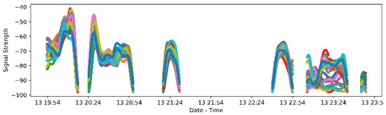 Signal of different iBeacons follow the same trend on the 13th of the month until around 23:00, indicating that they are in the original box provided by the clinician. After 23:00 signals have different trends indicating that iBeacons are set up in different rooms. Note that this is the first day that the participant received the iBeacons, and the devices stayed in the participant’s household for three months (as long as the duration of the clinical study).