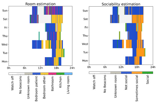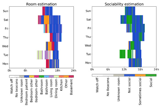 For the purposes of this work, we used the room and sociability (according to the caregiver’s room sociability labeling) location estimation per participant in the study, as a first step towards the insights we could derive from this kind of data for the everyday socializing patterns of the participants. In the following examples (Figure 5 and Figure 6), we visualized the one-week long location (room and sociability estimation) of two different participants with ASD, with daily location information starting from a Monday during the study to the following Sunday. Each color indicates a different room of the household in the room estimation figures, and the sociability level (i.e., not social, sometimes social and social according to the labeling of the caregivers) of the rooms, in the sociability estimation figures. Moreover, labels ‘Watch off’ indicate that the participant was not wearing the watch; ‘No beacons’ that the participant was wearing the watch, but has not registered beacon in proximity (i.e., maybe outdoors); and ‘Unknown room’ that the participant was at home, but the algorithm could not estimate the room with confidence.