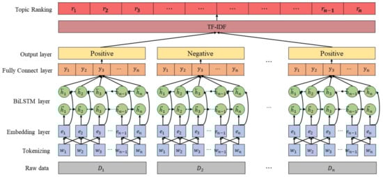 This section describes our proposed data filtering and ranking algorithm, WBiLSTM-TF-IDF, including its data acquisition method. The model filters out the data not related to disease outbreak using Word2Vec and BiLSTM and ranks disease-related hot words using TF-IDF. Figure 1 presents the overall architecture of WBiLSTM-TF-IDF.