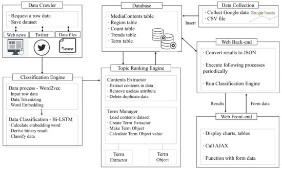 This section presents the details of the modules that make up our system. Figure 2 presents the system architecture of EagleEye. The data crawler collects news and SNS data by collecting Bing News articles using Azure API and tweets using Twitter API. The APIs [33] send the URL in JSON [34] format through HTTP [35] GET request. The collected data are stored in a CSV file with the search keyword, date, continent and selected country. The collected data files are sent to the classification engine. The data crawler gathers search query statistical data from Google Trends, which are stored in the database in the form of a CSV file. Data from Google Trends are collected using Pytrends API [36]. The classification engine consists of Word2Vec and Bi-LSTM. Using Word2Vec [37], each word is expressed by a vector value that represents the semantic closeness, and BiLSTM determines if the data are related to disease outbreaks. As a result, the classification engine extracts only the data related to disease outbreaks and sends them to the topic ranking engine.
