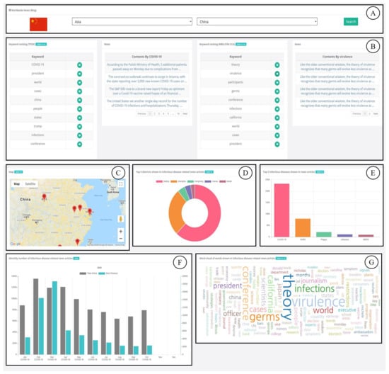 Web interface based on Bing News articles: (A): input form that allows the user to select the continent and country. (B) disease-related topic ranking based on the news articles collected with the disease keyword. (C) a map of the country (D) the raking of the top five districts where the largest number of disease-related news articles is reported. (E) the ranking of the top five diseases most frequently mentioned in disease-related news articles of the selected nation. (F) the trend of this year for a monthly total number of collected news articles and a monthly number of news articles of the most frequently shown disease. (G) disease-related word cloud based on collected disease-related news articles.