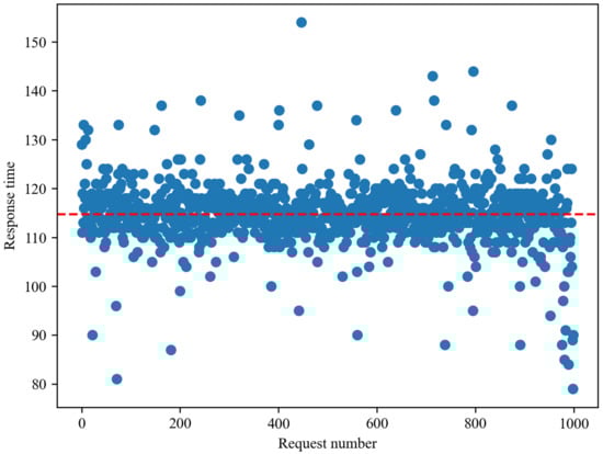 Figure 3 provides the user interface based on Bing news articles (http://www.epidemic.co.kr/worldwide/news (accessed on 6 July 2021)). It consists of seven components. Figure 3A is the input form that allows the user to select the continent and country. Users can select one of the continents and one country. For instance, in Figure 3, Asia and China are selected as an example. When the selection is completed, the information of the corresponding country is displayed. Figure 3B presents the disease-related topic ranking based on the news articles collected with the disease keyword. It also provides the list of titles and links of contents for news articles containing the topic when it is clicked. It is updated daily, and COVID-19 is currently at the top. Since displaying topic keywords and contents is one of the main functions of EagleEye, we conducted a response time test to check user convenience. We checked response times for 1000 requests using random keywords. Figure 4 shows the distribution of response times for 1000 requests. The red dotted line drawn horizontally means the average of response times, which was 114 ms, and the maximum response time was 155 ms. Figure 3C displays a map of the country. Markers are displayed on the map, and they are the regions that international airports are located in. Users can check the number of disease related news articles of the selected district by clicking a marker. The map is updated monthly. Figure 3D shows the raking of the top five districts where the largest number of disease-related news articles is reported, and it presents the number of disease-related news articles in each district. Figure 3E shows the ranking of the top five diseases most frequently mentioned in disease-related news articles of the selected nation. The images shown in Figure 3D,E are updated monthly. Figure 3F presents the trend of this year for a monthly total number of collected news articles and a monthly number of news articles of the most frequently shown disease. Finally, Figure 3G displays the disease-related word cloud based on collected disease-related news articles. The larger the word size, the more often the word appears in the news articles. Users can select the date for all data including past data as well as the current month. The tweets user interface (http://www.epidemic.co.kr/worldwide/twitter (accessed on 6 July 2021)), includes similar components to the user interface based on Bing news.
