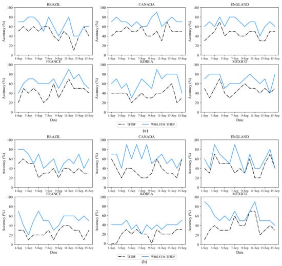 Figure 5 shows the accuracy of WBiLSTM-TF-IDF against a typical TF-IDF as a function of time for the six major countries for news articles and tweets. In data sources and in all countries, WBiLSTM-TF-IDF surpassed TF-IDF with the highest accuracy. For news articles, the average accuracy of the six countries was 45% for TF-IDF and 65% for WBiLSTM-TF-IDF, proving that our proposed model outperforms the typical TF-IDF by 44%. For tweets, the average accuracy was 39% for TF-IDF and 55% for WBiLSTM-TF-IDF, which shows that the proposed model improves performance by 40% compared to TF-IDF. Table 2 shows the average accuracy of WBiLSTM-TF-IDF and TF-IDF.