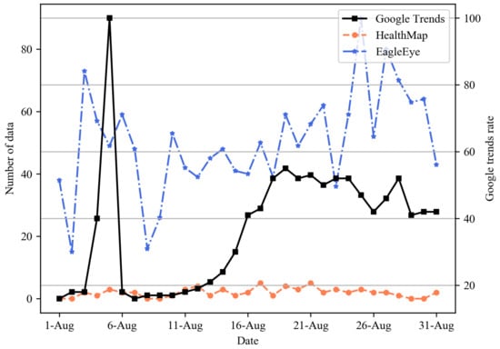 To evaluate the performance of our system, we compared EagleEye with HealthMap [11], one of the representative disease surveillance systems, in terms of the event detection capability. The experiment compared how well COVID-19, which prevailed in the world, was caught in EagleEye and HealthMap in terms of the speed and the quantity. We considered three major countries: Korea from 1 to 31 August, England from 20 August to 20 September, and Egypt from 18 May to 18 June. Figure 6, Figure 7 and Figure 8 present the daily time-series number of COVID-19-related data for three nations. As a ground truth reference line for performance comparison, we added the rate of COVID-19-related Google search query data collected from Google Trends. For Korea, as shown in Figure 6, Google Trends had the largest data on 5 August, and the data flow increased as of 14 August. In EagleEye, the data flow peaked on 3 August and an increase pattern like Google Trends. On the other hand, both the number and the flow of data did not change significantly and showed a constant level in Healthmap. For England, as shown in Figure 7, the Google Trends data increased after 4 September. The data flow of EagleEye showed an increasing pattern like Google Trends. Both the number and the flow of data showed a constant level in Healthmap. Finally, for Egypt, as shown in Figure 8, Google Trends, EagleEye and Healthmap had the most data on 30 May, 1 June and 2 June, respectively, but the number of data of Healthmap was significantly smaller than Google Trends and EagleEye. Experimental results show that EagleEye responds better than HealthMap when a disease-related event occurs: EagleEye can catch disease-related events faster and gather more relevant data than the HealthMap system.