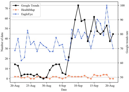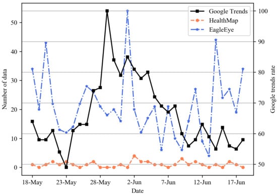Furthermore, our system provides data based on Google search (http://www.epidemic.co.kr/worldwide/trend (accessed on 6 July 2021)) and comparison of disease-related data obtained from the Bing News articles, Twitter tweets and Google search queries (http://www.epidemic.co.kr/worldwide/comparison (accessed on 6 July 2021)).