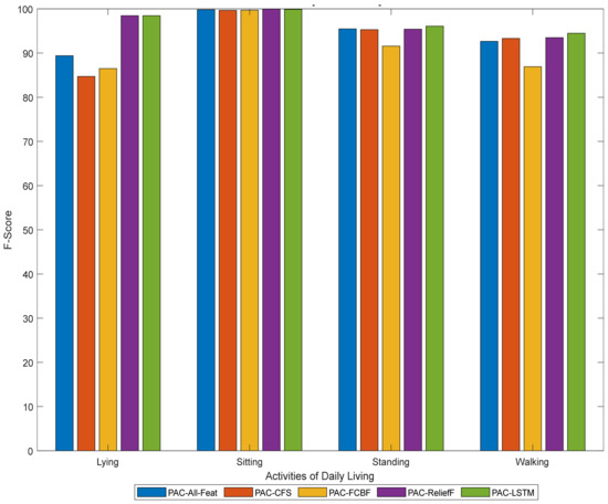 The overall performances obtained through classical machine learning algorithms and LSTM-based deep learning algorithms (see Table 3) suggest that both methodologies can accurately classify the ADLs. The best PAC system obtained in classical machine learning approaches is based on the feature set obtained through ReliefF, and its performance is quite close to the one obtained through deep learning, with a difference of 0.4% (97.23% vs. 96.83%). To get a better insight into class performance, the F-score obtained through all PAC systems is depicted in Figure 3, for both the classical machine learning- and the deep learning-based approaches. All the ADLs, i.e., sitting, standing, walking, and lying, are accurately classified by these PAC systems (PAC-ReliefF, PAC-LSTM) with very high performance by class (above 90%) and the differences in performance among these PAC systems for all classified ADLs are minimal (less than 1%, Table 3—columns 2 and 6).