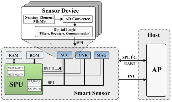 The SPU within the smart sensor is the actual smart part of the sensor. It enables the application developer to combine the data from all available sensors at one location and process the data directly on the sensor hardware. The processing can include the combination of multiple sensors to a so-called virtual sensor, a compression of the data to reduce the communication overhead to the Application Processor (AP), a filtering of the data, or the detection of gestures or steps. Typically, the SPU in a smart sensor is an energy efficient µC such as an ARM Cortex M0+ e.g., in the BMF055 by BST [20] or an application specific proprietary processing unit as used in [21]. Generally, the SPU is accompanied by an additional memory unit that is connected via a memory interface or a standard communication interface. The Read Only Memory (ROM) contains the actual program code that is executed on the SPU and constant values used by the program. The RAM is used for intermediate results, the function stack, or acts as a buffer for the communication with the AP.