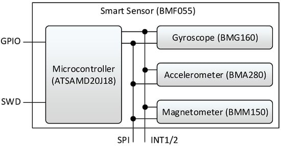 The firmware of the SiL prototype is implemented on a BMF055 programmable smart sensor from Bosch Sensortec [20]. This smart sensor is implemented as a System in Package. Hence, the sensor consists of different dice which are all connected in the same package. The BMF055 contains three sensors, a 16-bit triaxial gyroscope [22], a triaxial 14-bit accelerometer [23] and a triaxial geomagnetic sensor [24]. The µC used in the BMF055 is the 32 bit Cortex M0+ microcontroller [25]. The components of the BMF055 are depicted in Figure 2.