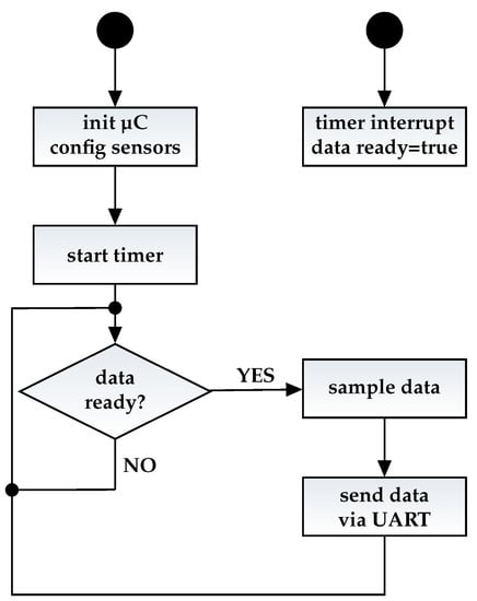 The SiL demonstration application has been implemented using the example firmware implementation of the BMF055 called “Data Stream”. This example shows how to sample data from all three sensors in a straightforward manner. The firmware samples the data from the sensors with an individual configurable data rate and sends it to the host using Universal Asynchronous Receiver Transmitter (UART) interface of the µC. The example firmware has been extended to implement the SiL library and provide the necessary SiL functionality. The flow chart of the firmware can be seen in Figure 3.
