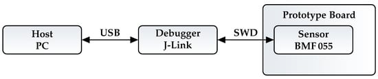 The debugger is connected to the host via a USB cable. The actual smart sensor is held by a BMF055 shuttle board which is placed on a breakout board provided by Bosch Sensortec. The standard 20 pin connector from the breakout board is connected to the J-Link debugger via the Serial Wire Debug Interface (SWD). Figure 4 shows an overview of the physical connection.