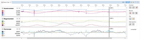 The Sensor View can handle signals with different sampling rates at the same time. The data from the accelerometer displayed in Figure 6 is sampled with 800 Hz. The data from the magnetometer is sampled with 100 Hz and the gyroscope shows a sampling rate of 1.6 kHz. The controls for the GUI are located at the right, grouped by their functionality. The first group contains the controls to connect to the sensor as well as the selection of the configuration file for the whole session. The second group handles the recording of the data from the sensor. It also offers the possibility to reset the captured data. The controls to save fetched sensor data or load previously recorded data are organized in group 3. The last group contains the controls to start and stop the injection of the loaded sensor data back into the sensor. Using the checkboxes left to the signals, one can choose, which signals should be injected into the sensor on the next run.