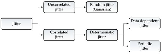 In current state of literature, jitter is described as a deviation in time from the real clock edge or periodicity in a periodic signal [29,30,31]. Usually, the overall jitter is composed of two categories, random jitter and deterministic jitter [31]. Figure 9 shows an overview of the different kinds of jitters and their relations.