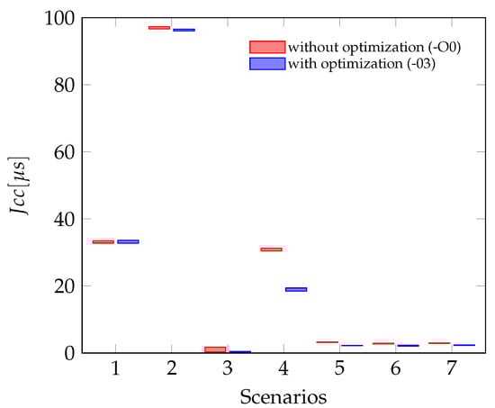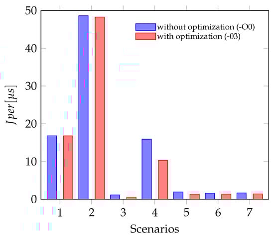 The results of the statistical analysis for the test cases without compiler optimization, can be seen in Table 9. The row Contribution [%] shows that the method, i.e., the scenario, has, by far, the largest influence on the total variation. The remaining two parameters only contribute marginally to the overall result. The influence of the part or the different sensors used is close to zero. The repetition of the experiment also has close to zero influence on the overall result.