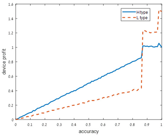 As user understanding of the privacy increases, i.e., as decreases from in Figure 1 to and in Figure 2 and Figure 3, respectively, the devices with a high privacy risk (type H) maximize their profit at lower accuracy values. This does not hold when the user knowledge of the device’s risk is high ( in Figure 4), since in this case, the users are aware of the privacy risk and thus the profit is maximized when the device outputs accurate support.