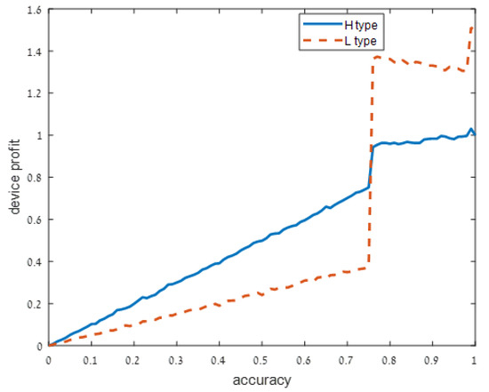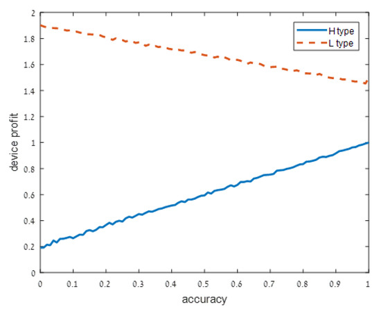 Figure 1 shows that when the signal on the device type is extremely noisy (), both high and low device types profit from a higher accuracy strategy q, but the high-risk device type is better off if . In other words, both device types profit from sharing more accurate information and support with the user, but high privacy risk devices should be careful not to fully utilize all of their capabilities.