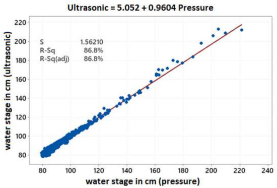 Figure 3, the correlation was strong revealing that the sensors did not deviate considerably from each other at any level of the water stage recorded within the 9-month period with available data. Water stage minima were consistently in agreement, at around 80–100 cm, and could rise up to 200–220 cm during high flow episodes.
