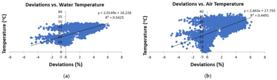 Figure 5 between % deviations and temperatures, the positive nature of the correlation was confirmed. We see that either with a water or air temperature increase the sign of deviation shifted from negative to positive. There were two big clouds of data-pairs, one in the negative and the other in the positive side of deviations (