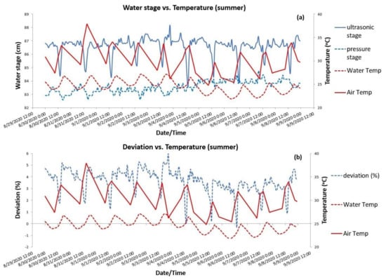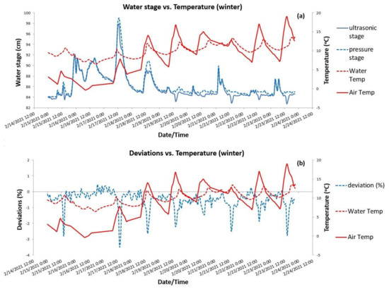 Figure 7b). However, although they were small, all deviation peaks occurred when air temperature was peaking, with a negative sign due to the (slightly) lower ultrasonic measurements compared to the pressure ones. Excluding the dates with stage peaks, which were obviously caused by increased streamflow, the no-peak hydrologic conditions occurred in 19–20 and 22–23 February revealed a similar behavior of the ultrasonic sensor over air temperature with the behavior observed in the summer period of