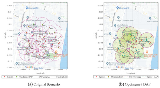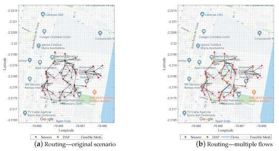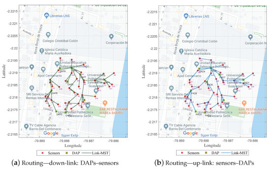 Therefore, to find the minimum cost of the tree, Dijkstra’s algorithm was used. The model presented two minimum-cost trees from two Dijkstra variations. Figure 4a shows the solution generated in the shortest time ( s) by starting the routing from the DAPs to the sensors (down-link).
