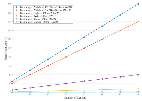 Figure 3 indicates the variations in power consumption among the wireless technologies. It is remarkable to see that when opting for a single technology, such as a cellular network, energy consumption is higher than for technologies that have lower coverage but have a multi-hop option and lower energy consumption.