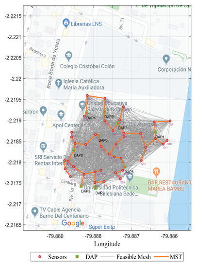 A variation of the routing presented in this work allowed us to make a minimum spanning tree (MST) to link the resources to be placed (sensors and DAPs). This offered the possibility of achieving an MST that generated resilience when interconnecting the resources. This solution is less expensive than a partial or total mesh topology in smart cities depending on the type of application. If it is necessary to ensure the real-time collection of information, this type of routing can contribute. Figure 5 presents a feasible mesh from the distance restriction represented by the coverage radius ( m); it depends on this variable. The MST was determined to generate a multi-cast routing.