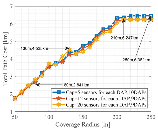 The capacity of each DAP has a direct impact on the search for optimal candidate sites and the problem graph because the selected DAPs may be different. Therefore, there is a direct impact on the total path cost when varying the capacity of a DAP. However, when the capacity of each DAP is low, the total path cost is higher and may remain somewhat higher in contrast to medium or higher capacities. Figure 8 also shows that there is a trend of linear growth as the the radius of coverage becomes more significant. Depending on the arrangement of the resulting networks, scenarios with higher total path costs can occur. Finally, Figure 8 shows that after 200 m of coverage, the total path cost remains constant.